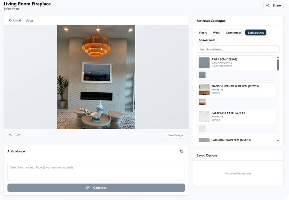 The workflow is radically simpler than what it replaced. Designers upload a standard 2D room photo taken on a smartphone. They select materials directly from an integrated product catalog. They type specific stylistic requirements into a chat field. The tool generates a photorealistic rendering.